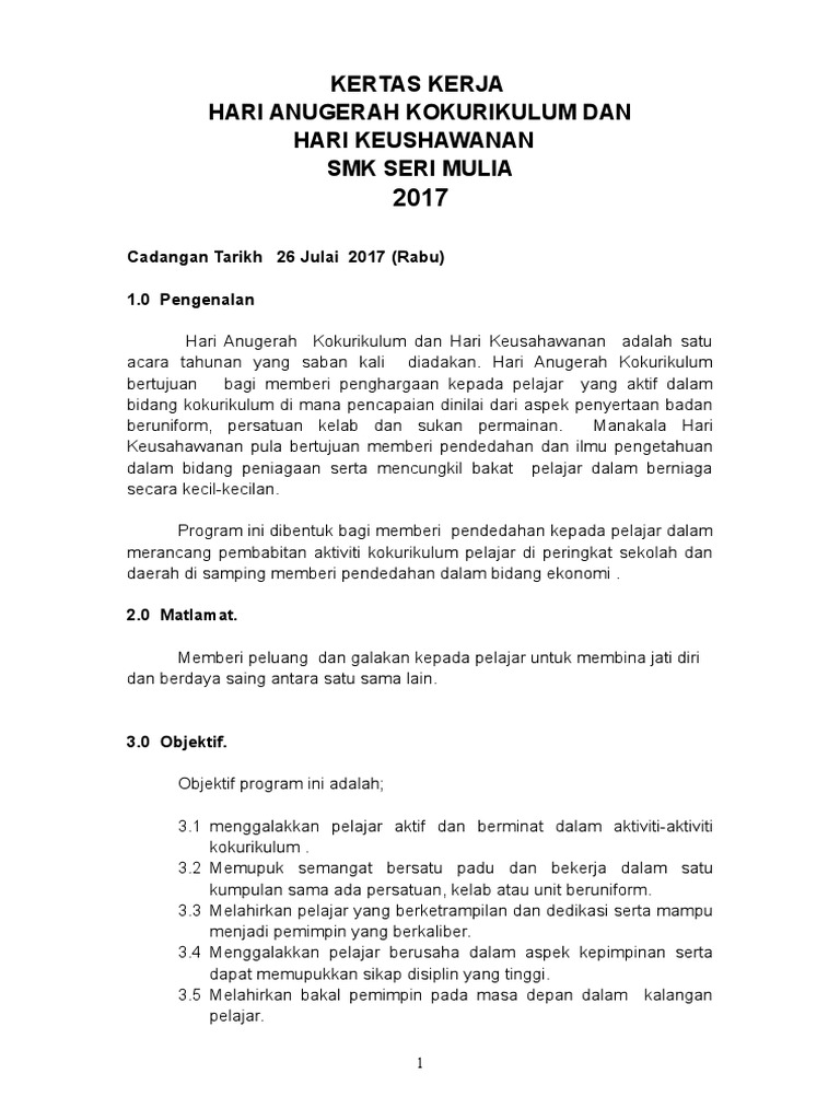 KERTAS KERJA HARI KOKURIKULUM KEUSAHAWANAN SKLK 2016 BIL BUTIRAN PERBELANJAAN JUMLAH RM 1 Hadiah Kawad Kaki 4 pasukan x RM 3500 RM 14000 2 Hadiah reka cipta 5 pasukan x RM 3500 RM 17500 3 Sijil RM 2000 JUMLAH BESAR RM 33500 9. Selain itu juga ada juga sekolah yang turut memberi penghargaan kepada murid yang lemah tetapi meningkat naik prestasinya contohnya yang. Kertas kerja hari anugerah kokurikulum Thursday December 30 2021 Edit - Penyampaian anugerah - Penyampaian cenderamata - Lawatan ke geraitapak-tapak aktiviti 100 petang Jualan gerai tamat 70 STRATEGI PELAKSANAAN 71 Menyediakan Pelan Operasi Kertas Kerja Program 72 Memohon pengesahan daripada pentadbir 73 Mengadakan mesyuarat.